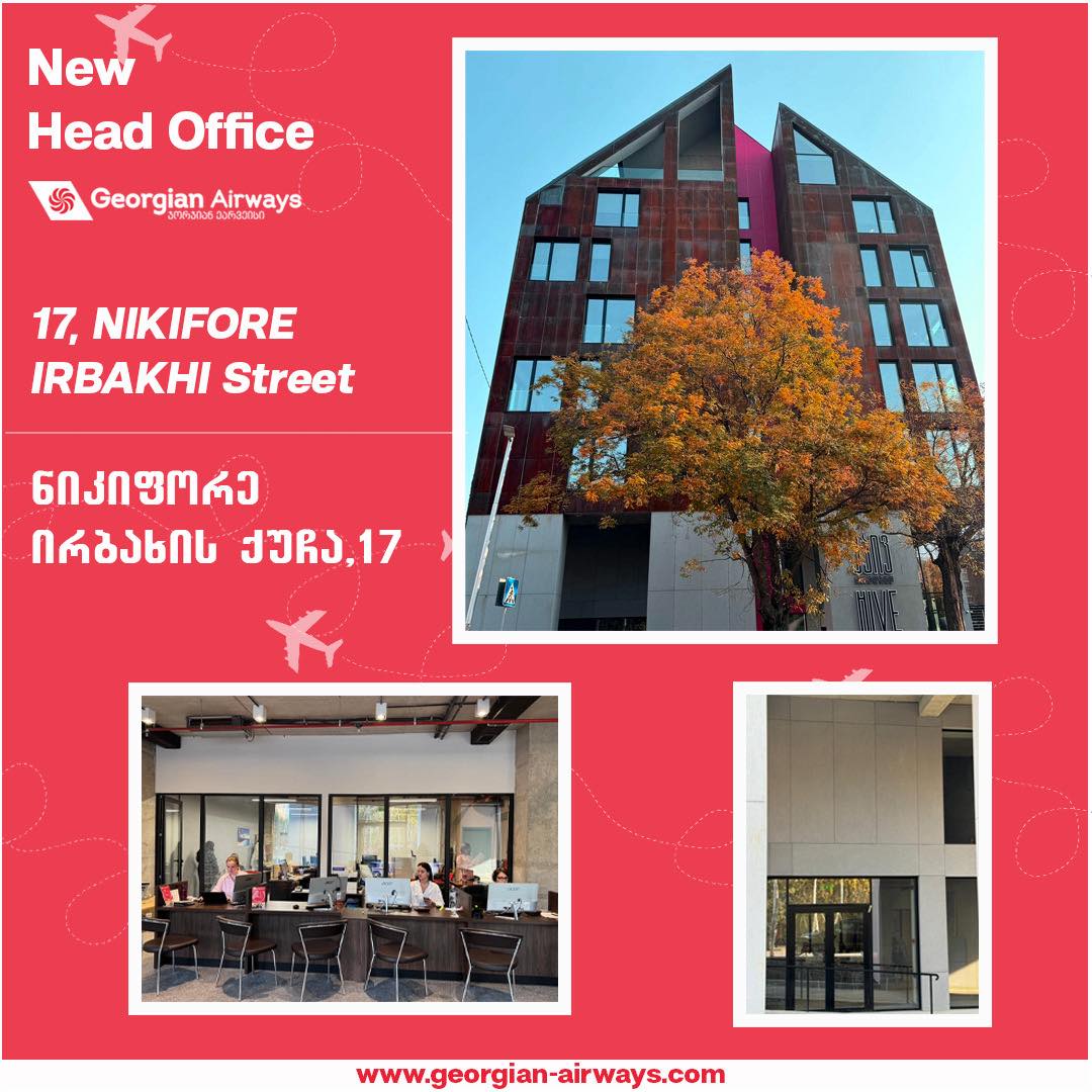 ძვირფასო მგზავრებო!გაცნობებთ, რომ შეიცვალა ჩვენი გაყიდვების ოფისის მისამართი.ავიაბილეთების შესაძენად გელოდებით ახალ მისამართზე: ნიკიფორე ირბახის